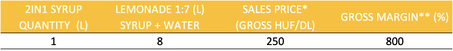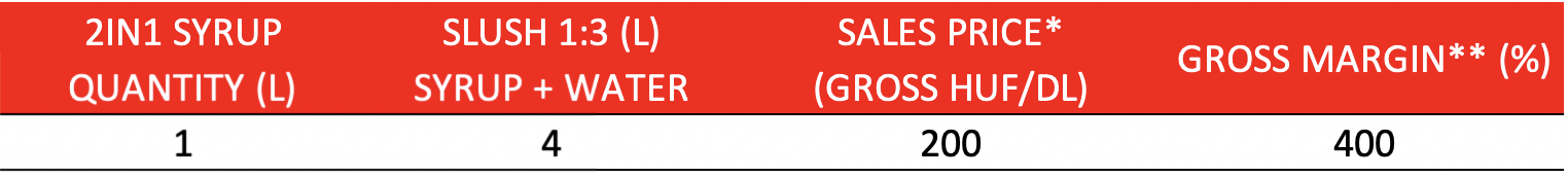 SLUSH – Pölöskei ‘2in1’ syrup becomes a slush or lemonade base depending on the dilution. We would like to use an example calculation to illustrate the potential of this product range: