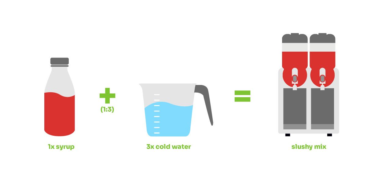 A 1:3 mixing ratio will make 40 litres of slush and a 1:7 mixing ratio will make 80 litres of lemonade.